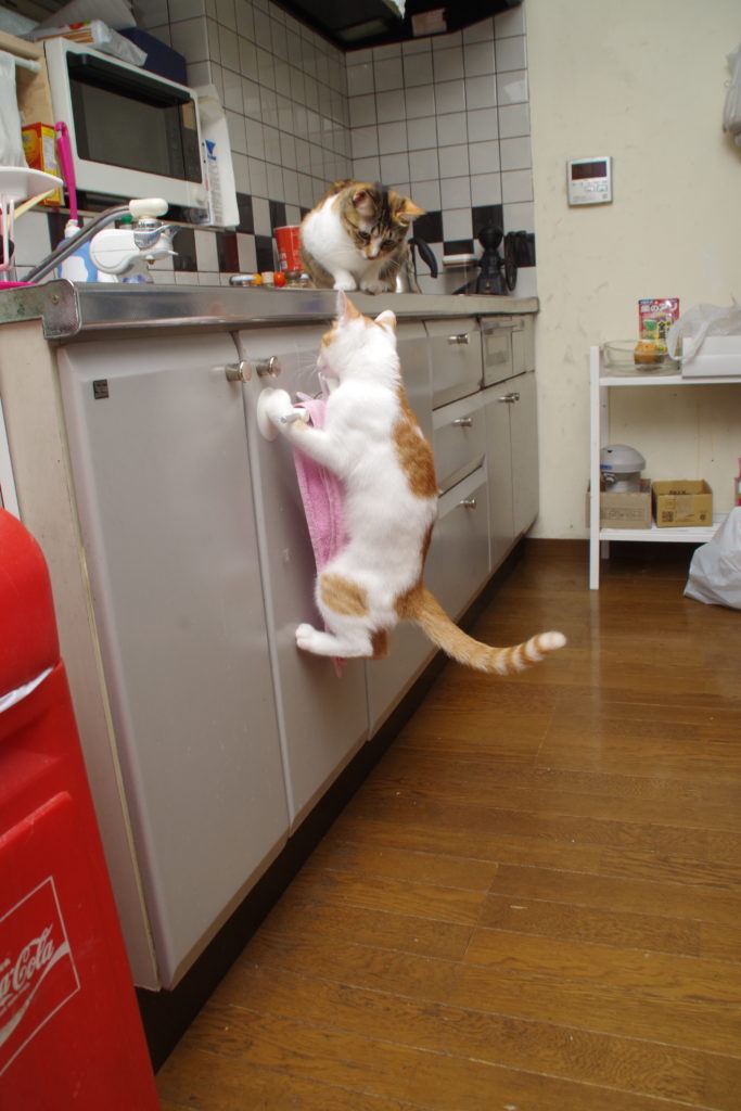 一生懸命流しの上に乗ろうとジャンプするもまだ届かず。