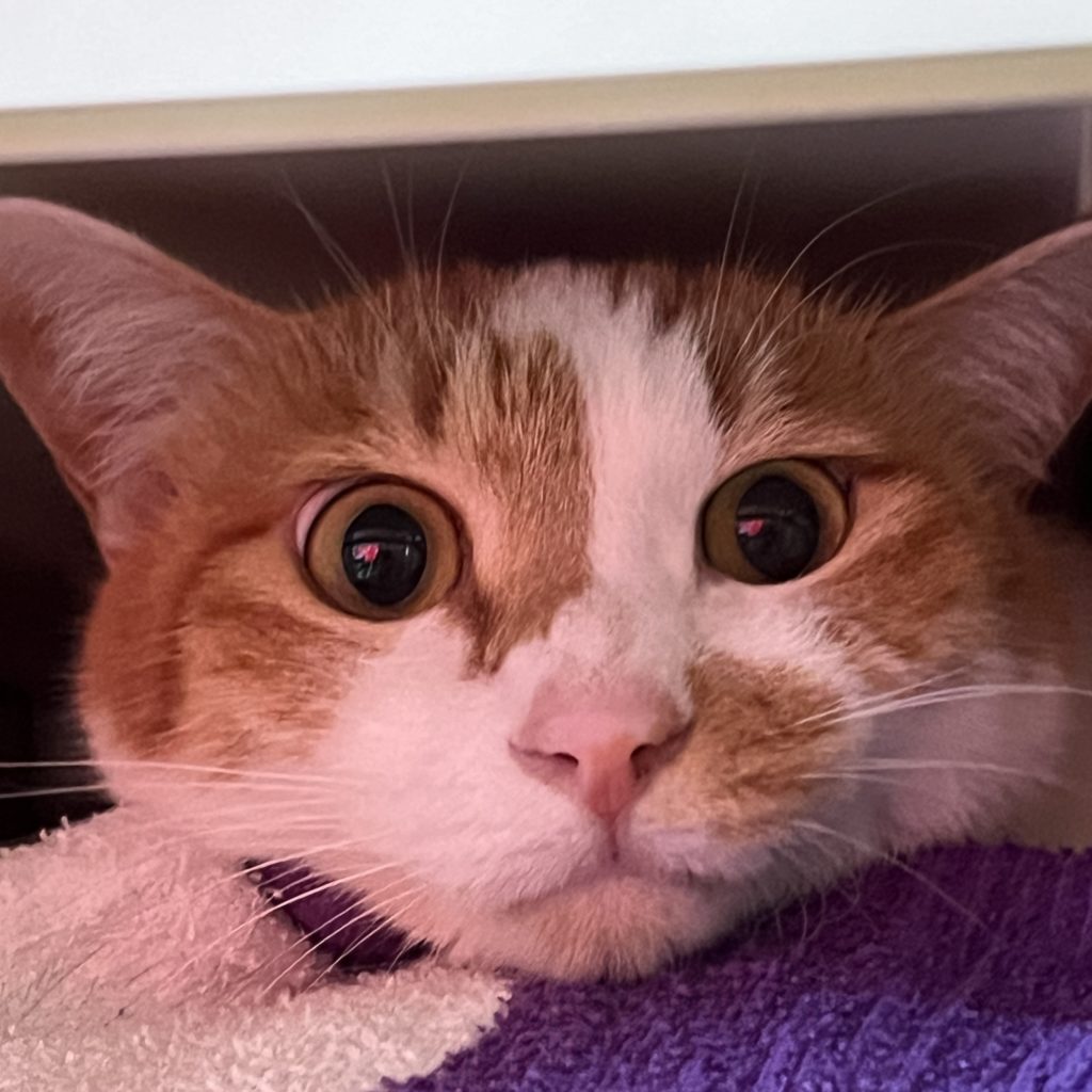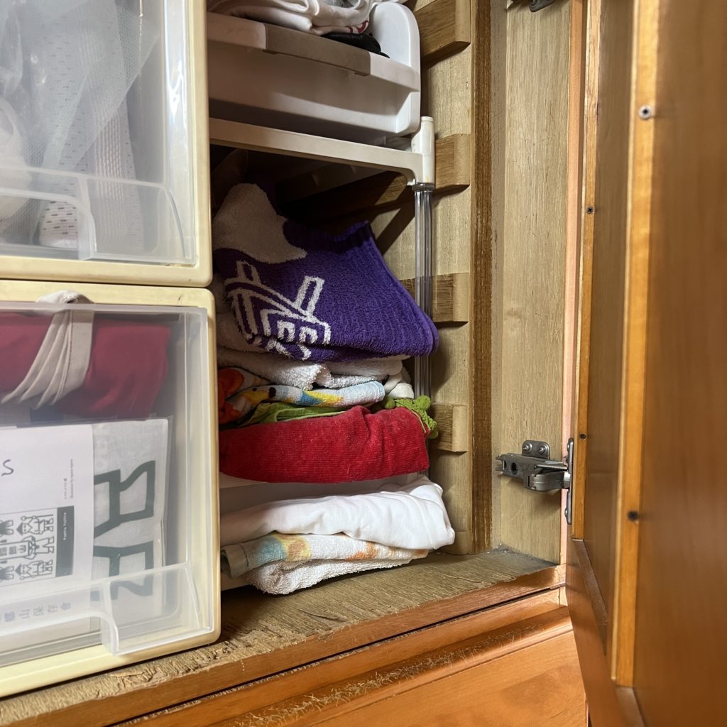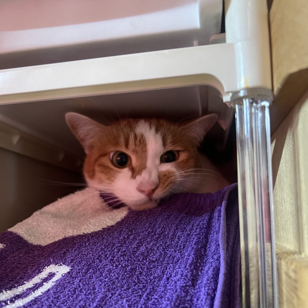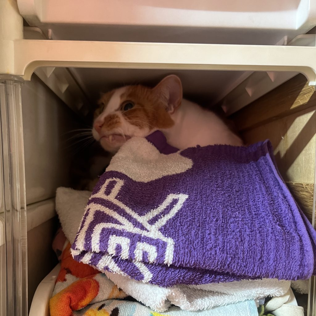 おいなりちゃんの姿が見えないので、探したら、タオル置場で動く気配が!